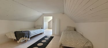 Upstairs there is a walk-through room with two single beds and a separate bedroom with a double bed. The double bed can easily be converted into two single beds if necessary.